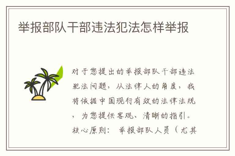 对于您提出的举报部队干部违法犯法问题,从法律人的角度,我将依据中国现行有效的法律法规,为您提供客观、清晰的指引。