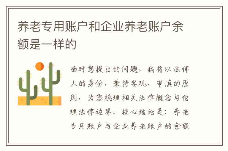 核心结论是:养老专用账户与企业养老账户的余额,在法律上并非同一概念,其资金来源、管理方式、所有权归属和法律适用均存在本质区别。如果涉及伦理法律问题,必须严格遵循法律的明确规定。