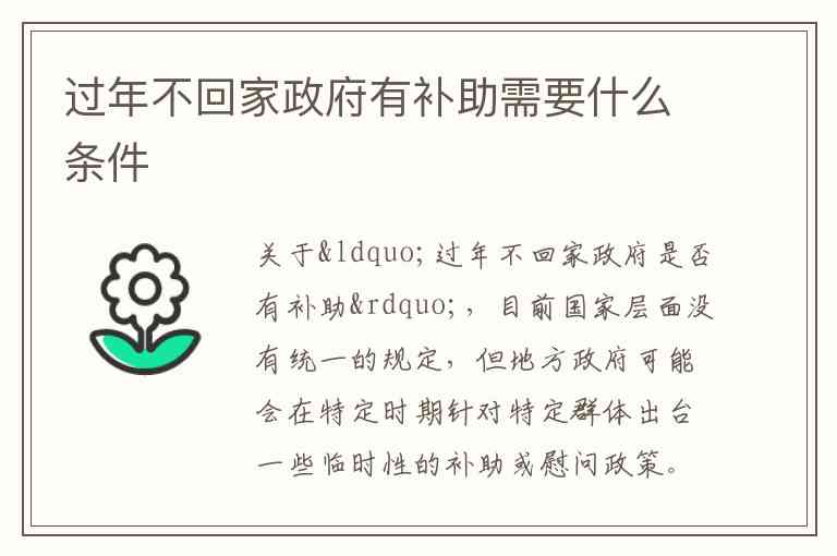 关于“过年不回家政府是否有补助”,目前国家层面没有统一的规定,但地方政府可能会在特定时期针对特定群体出台一些临时性的补助或慰问政策。这类政策通常有明确的适用范围和条件。