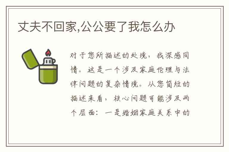 对于您所描述的处境,我深感同情。这是一个涉及家庭伦理与法律问题的复杂情境。从您简短的描述来看,核心问题可能涉及两个层面:一是婚姻家庭关系中的矛盾(丈夫不回家),二是可能涉及更为严重的违法行为(公公的行为)。