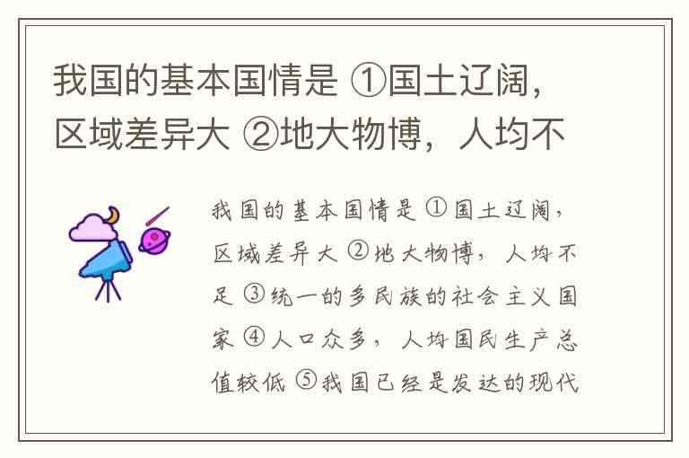 我国的基本国情是 ①国土辽阔,区域差异大 ②地大物博,人均不足 ③统一的多民族的社会主义国家 ④人口众多,人均国民生产总值较低 ⑤我国已经是发达的现代化国家 A. ①②③ B. ②③④ C. ①②③④ D. ①②③④⑤