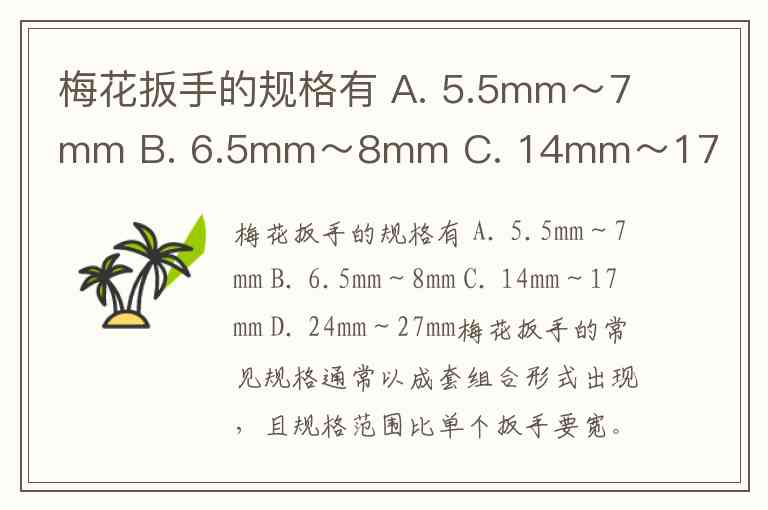 梅花扳手的规格有 A. 5.5mm~7mm B. 6.5mm~8mm C. 14mm~17mm D. 24mm~27mm