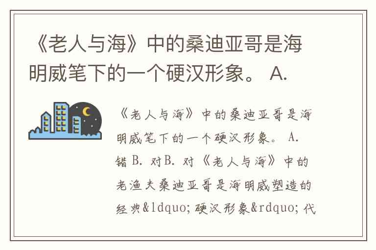 《老人与海》中的桑迪亚哥是海明威笔下的一个硬汉形象。 A. 错 B. 对