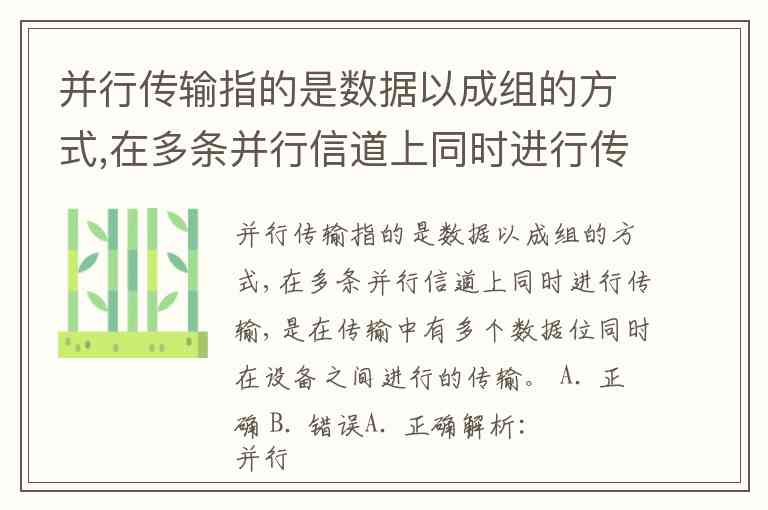 解析:并行传输是指多个数据位(如 8 位、16 位等)同时在多条独立的物理信道(例如多条并行的电线或光纤)上同时传输。这种方式通常用于短距离、高速数据传输场景(如计算机内部总线、打印机电缆等)。题目描述“数据以成组的方式,在多条并行信道上同时传输”符合并行传输的基本定义。