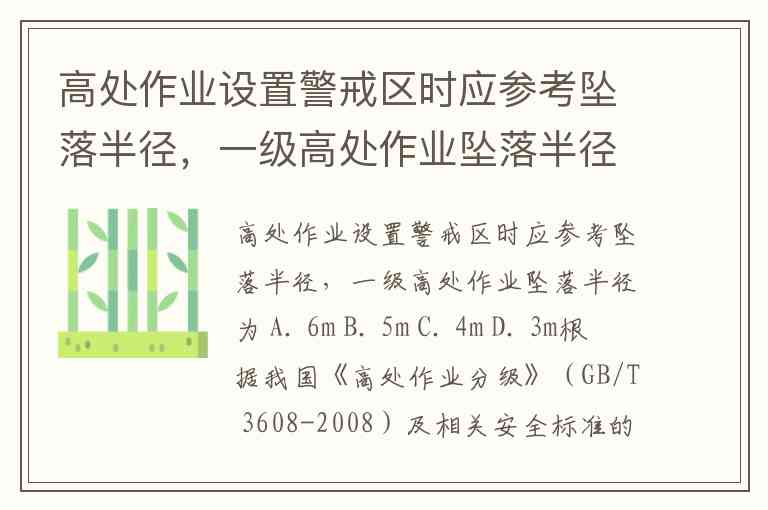 高处作业设置警戒区时应参考坠落半径,一级高处作业坠落半径为 A. 6m B. 5m C. 4m D. 3m