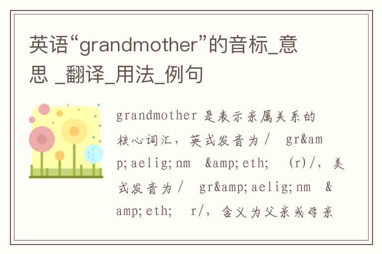 grandmother 是表示亲属关系的核心词汇,英式发音为 /ˈɡrænmʌðə(r)/,美式发音为 /ˈɡrænmʌðər/,含义为父亲或母亲的母亲,即中文里的“(外)祖母”“奶奶”或“外婆”。作为名词,它可泛指女性祖先或年长女性前辈;作为动词时,意为“当…的祖母”,但日常使用中以名词为主。