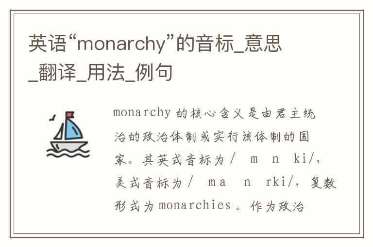 monarchy 的核心含义是由君主统治的政治体制或实行该体制的国家。其英式音标为 /ˈmɒnəki/,美式音标为 /ˈmɑːnərki/,复数形式为 monarchies 。作为政治术语,它既指代 君主制度(如君主立宪制或绝对君主制),也可指 君主国 这一国家形态。