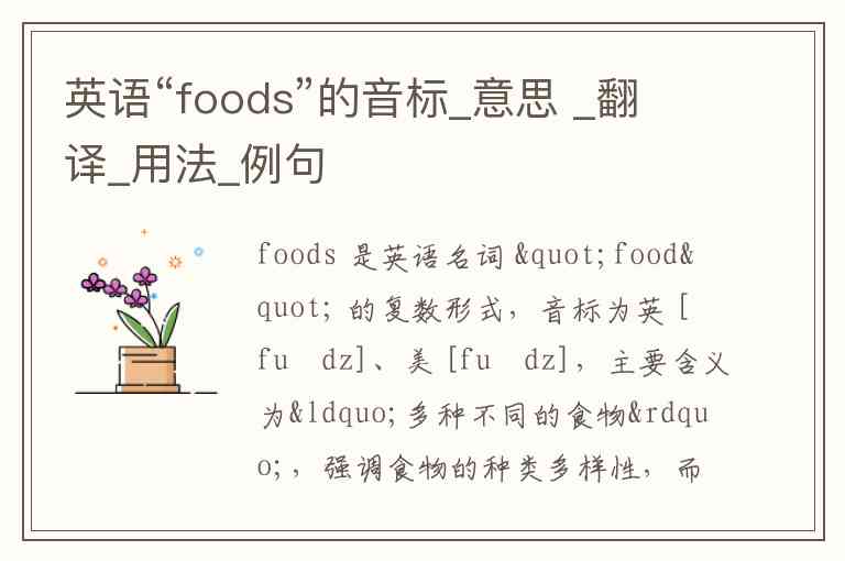 foods 是英语名词 "food" 的复数形式,音标为英 [fuːdz]、美 [fuːdz],主要含义为“多种不同的食物”,强调食物的种类多样性,而非泛指食物整体概念。作为可数名词复数,它通常用于描述具体类别、类型或种类的食品,例如“健康食品”“加工食品”等场景。