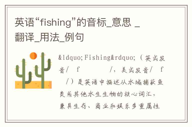 “Fishing”(英式发音/ˈfɪʃɪŋ/,美式发音/ˈfɪʃɪŋ/)是英语中描述从水域捕获鱼类或其他水生生物的核心词汇,兼具生存、商业和娱乐多重属性。作为人类最古老的生产活动之一,它既可以指使用钓竿、渔网等工具的具体行为,也可指代渔业产业链或休闲爱好,甚至衍生出“试探”“网络钓鱼”等隐喻用法。