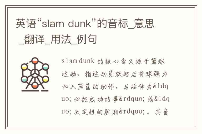slam dunk 的核心含义源于篮球运动,指运动员跃起后将球强力扣入篮筐的动作,后延伸为“必然成功的事”或“决定性的胜利”。其音标为英 /ˈslæm dʌŋk/、美 /ˈslæm dʌŋk/,可作名词或动词使用。