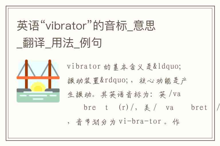 vibrator 的基本含义是“振动装置”,核心功能是产生振动。其英语音标为:英 /vaɪˈbreɪtə(r)/,美 /ˈvaɪˌbretɚ/,音节划分为 vi-bra-tor 。作为名词,它有多重专业释义:在机械领域指“振动器”或“振荡器”,在电子领域称“振子”,在医疗或日常场景中可表示“振动按摩器”,还可指代乐器中的“簧片”或建筑工具“振动滚筒”。其复数形式为 vibrators 。