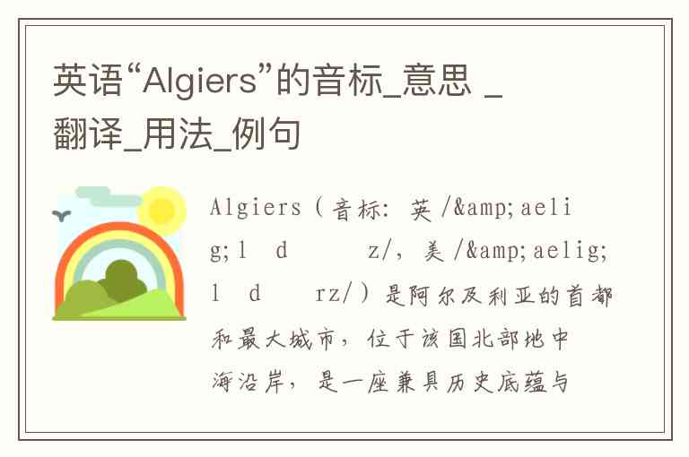 Algiers(音标:英 /ælˈdʒɪəz/,美 /ælˈdʒɪrz/)是阿尔及利亚的首都和最大城市,位于该国北部地中海沿岸,是一座兼具历史底蕴与地中海气候特征的港口城市。作为北非重要的政治、经济和文化中心,其名称在语境中通常指代这座城市,无其他常见释义。