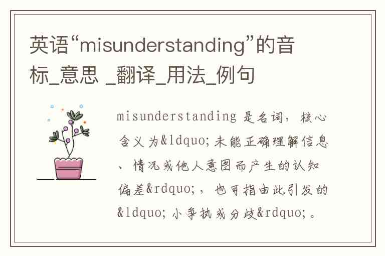 misunderstanding 是名词,核心含义为“未能正确理解信息、情况或他人意图而产生的认知偏差”,也可指由此引发的“小争执或分歧”。其英式音标为 /ˌmɪsʌndəˈstændɪŋ/,美式音标为 /ˌmɪsʌndərˈstændɪŋ/,复数形式为 misunderstandings。