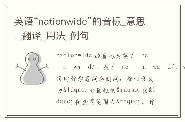 nationwide 的音标为英 /ˌneɪʃnˈwaɪd/、美 /ˌneɪʃnˈwaɪd/,可同时作形容词和副词,核心含义为“全国性的”或“在全国范围内”。作为形容词时,它描述覆盖整个国家的事物;作为副词时,表示动作或状态在全国范围内发生,两者用法需根据语境判断。