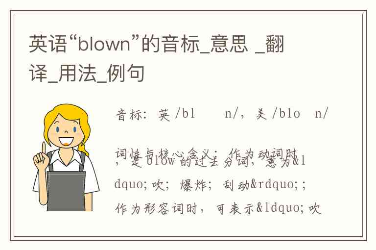 词性与核心含义:作为动词时,是 blow 的过去分词,意为“吹;爆炸;刮动”;作为形容词时,可表示“吹制的;喘气的;(非正式)配有涡轮增压器的”。