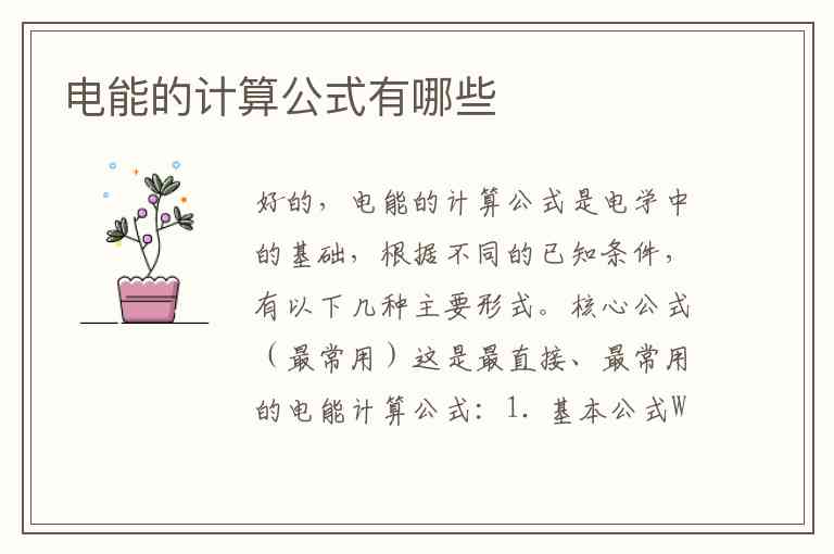 好的,电能的计算公式是电学中的基础,根据不同的已知条件,有以下几种主要形式。