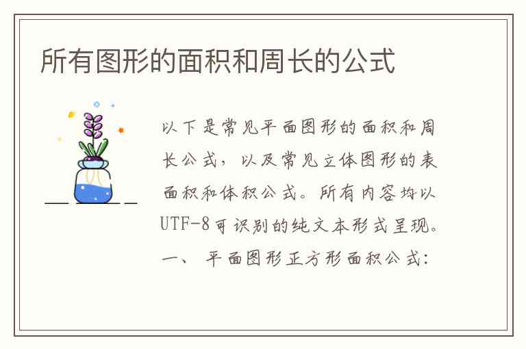 以下是常见平面图形的面积和周长公式,以及常见立体图形的表面积和体积公式。所有内容均以UTF-8可识别的纯文本形式呈现。