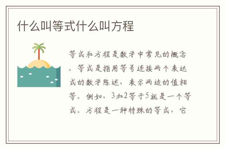 方程是一种特殊的等式,它包含一个或多个未知数,并且通常需要求解这些未知数的值。例如,x加2等于5就是一个方程,其中x是未知数,通过解方程可以找到x的值为3。