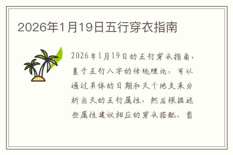 2026年1月19日的五行穿衣指南,基于五行八字的传统理论,可以通过具体的日期和天干地支来分析当天的五行属性,然后根据这些属性建议相应的穿衣搭配。