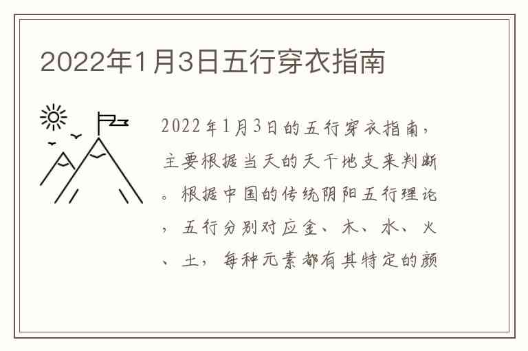 2022年1月3日的五行穿衣指南,主要根据当天的天干地支来判断。根据中国的传统阴阳五行理论,五行分别对应金、木、水、火、土,每种元素都有其特定的颜色、材质和能量。这一天的五行与穿衣相关,主要取决于当天的干支。