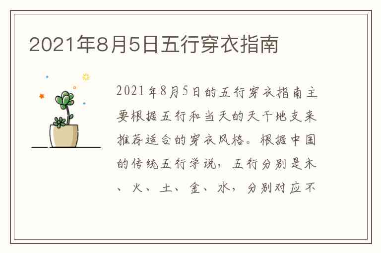 2021年8月5日的五行穿衣指南主要根据五行和当天的天干地支来推荐适合的穿衣风格。根据中国的传统五行学说,五行分别是木、火、土、金、水,分别对应不同的颜色和元素。具体到这一天,2021年8月5日是农历辛丑年六月二十六日,天干是辛(金),地支是丑(土)。