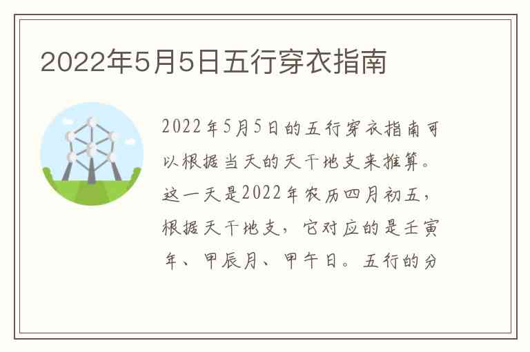 2022年5月5日的五行穿衣指南可以根据当天的天干地支来推算。这一天是2022年农历四月初五,根据天干地支,它对应的是壬寅年、甲辰月、甲午日。五行的分析可以从这几个方面进行:年、月、日的天干地支,以及对应的五行属性。