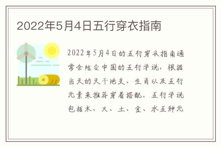 2022年5月4日的五行穿衣指南通常会结合中国的五行学说,根据当天的天干地支、生肖以及五行元素来推荐穿着搭配。五行学说包括木、火、土、金、水五种元素,每种元素与不同的颜色、材质和形态有关。因此,适合当天的五行穿衣搭配将会考虑这些因素。