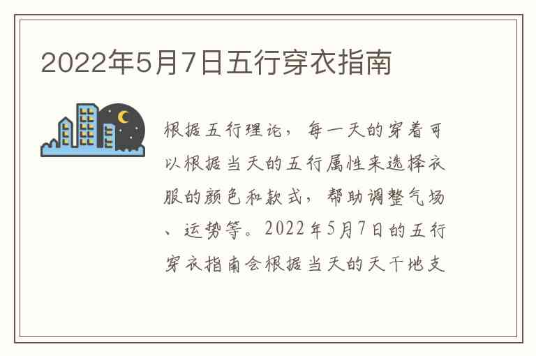 根据五行理论,每一天的穿着可以根据当天的五行属性来选择衣服的颜色和款式,帮助调整气场、运势等。2022年5月7日的五行穿衣指南会根据当天的天干地支来推算。