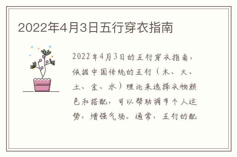 2022年4月3日的五行穿衣指南,依据中国传统的五行(木、火、土、金、水)理论来选择衣物颜色和搭配,可以帮助调节个人运势,增强气场。通常,五行的配色和穿搭会考虑当天的天干地支,以及个人的八字命理,但如果你想要一个简单的参考,我可以给你一个大致的指南。