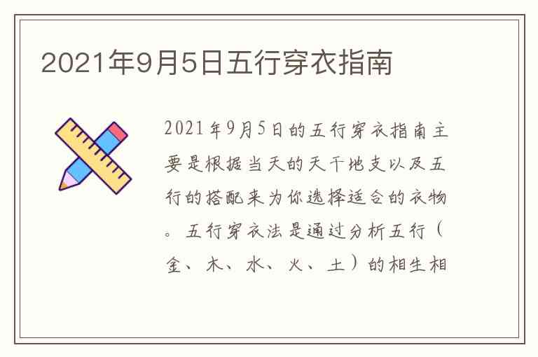 2021年9月5日的五行穿衣指南主要是根据当天的天干地支以及五行的搭配来为你选择适合的衣物。五行穿衣法是通过分析五行(金、木、水、火、土)的相生相克关系,帮助选择适合的颜色和风格,以达到与自身气场的和谐。