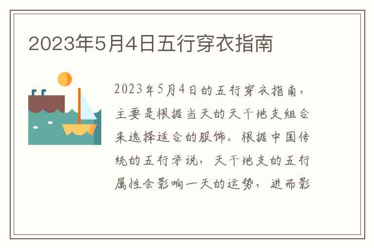 2023年5月4日的五行穿衣指南,主要是根据当天的天干地支组合来选择适合的服饰。根据中国传统的五行学说,天干地支的五行属性会影响一天的运势,进而影响穿衣的选择。