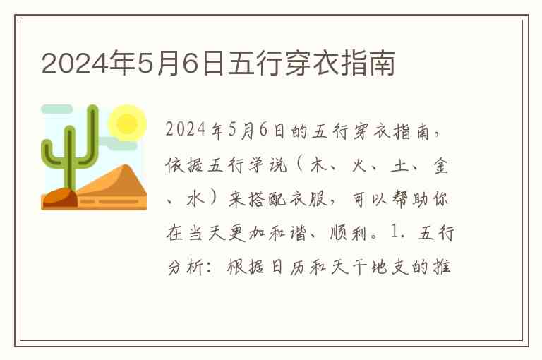 2024年5月6日的五行穿衣指南,依据五行学说(木、火、土、金、水)来搭配衣服,可以帮助你在当天更加和谐、顺利。
