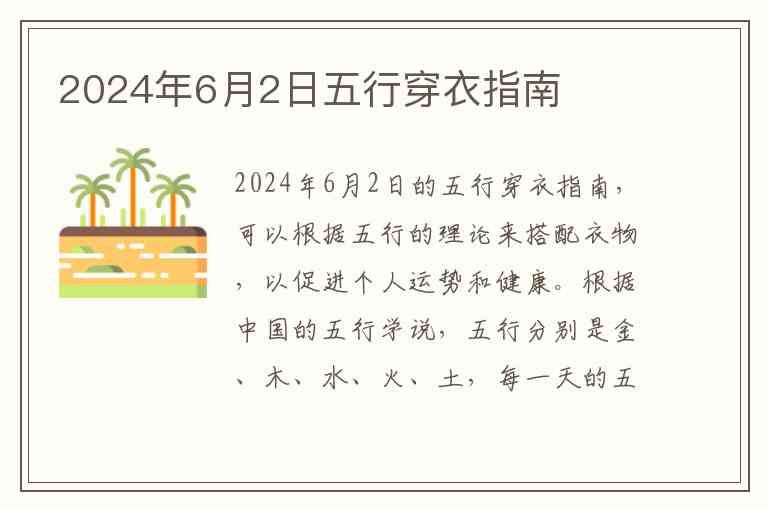 2024年6月2日的五行穿衣指南,可以根据五行的理论来搭配衣物,以促进个人运势和健康。根据中国的五行学说,五行分别是金、木、水、火、土,每一天的五行能量可能会有所不同,影响我们该穿什么颜色和风格的衣物。我们可以通过这些元素来平衡和调整个人的气场。