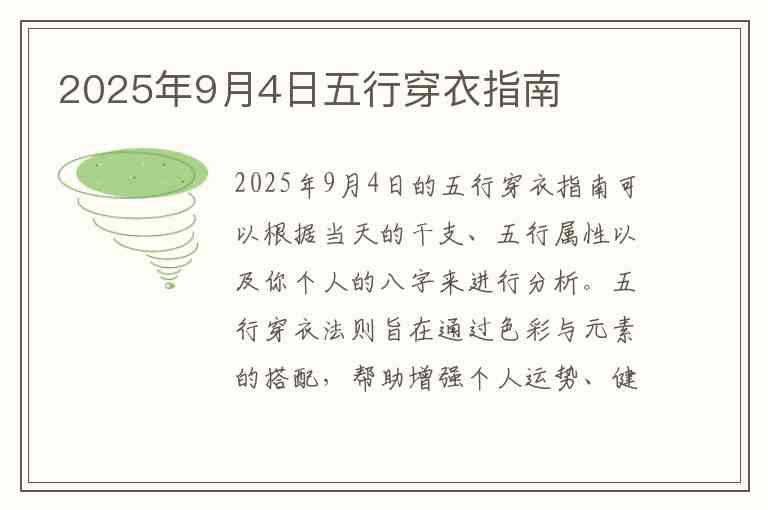 2025年9月4日的五行穿衣指南可以根据当天的干支、五行属性以及你个人的八字来进行分析。五行穿衣法则旨在通过色彩与元素的搭配,帮助增强个人运势、健康、财运等。