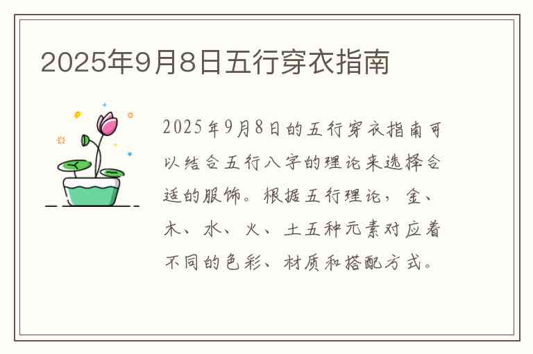 2025年9月8日的五行穿衣指南可以结合五行八字的理论来选择合适的服饰。根据五行理论,金、木、水、火、土五种元素对应着不同的色彩、材质和搭配方式。每一天的天干地支、五行的流转会影响到适合的穿衣风格和颜色。