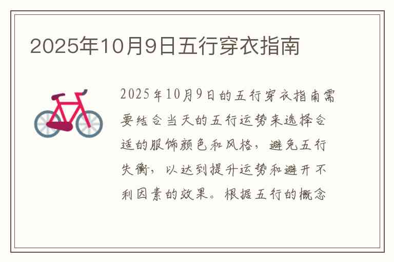 2025年10月9日的五行穿衣指南需要结合当天的五行运势来选择合适的服饰颜色和风格,避免五行失衡,以达到提升运势和避开不利因素的效果。根据五行的概念,我们可以通过分析天干地支、阴阳五行等因素来确定当天的穿衣宜忌。以下是根据五行理论的穿衣建议: