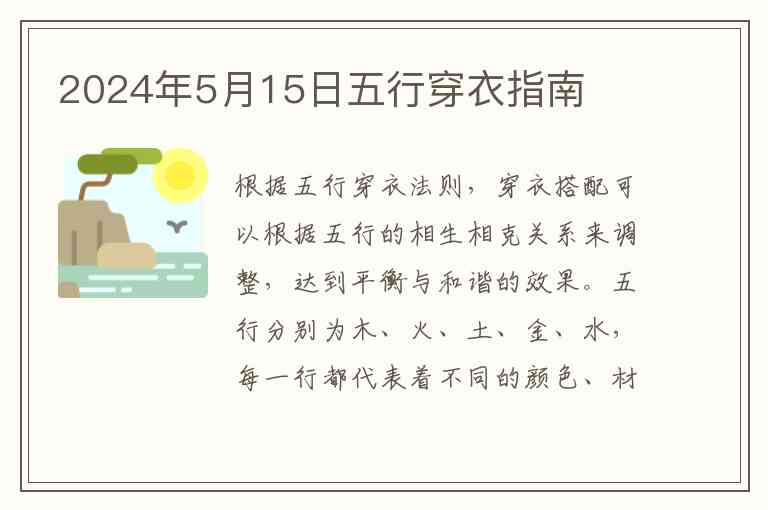 根据五行穿衣法则,穿衣搭配可以根据五行的相生相克关系来调整,达到平衡与和谐的效果。五行分别为木、火、土、金、水,每一行都代表着不同的颜色、材质和特质。
