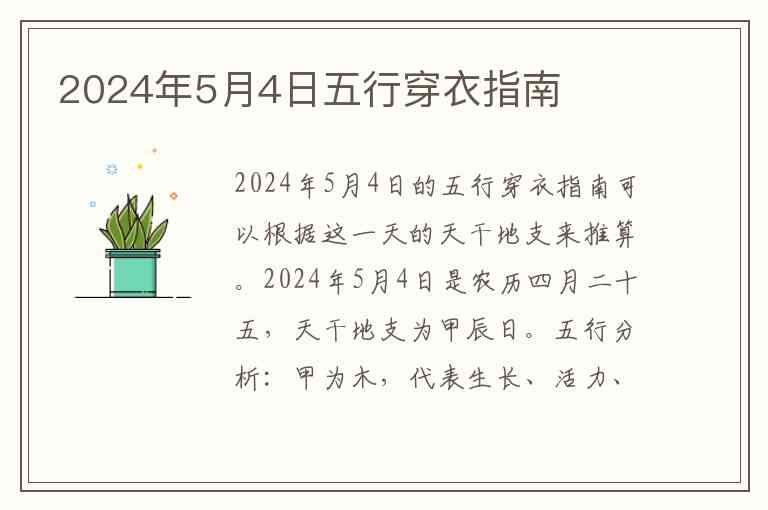 2024年5月4日的五行穿衣指南可以根据这一天的天干地支来推算。2024年5月4日是农历四月二十五,天干地支为甲辰日。