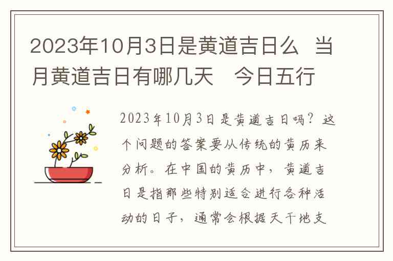 2023年10月3日是黄道吉日吗?这个问题的答案要从传统的黄历来分析。在中国的黄历中,黄道吉日是指那些特别适合进行各种活动的日子,通常会根据天干地支、五行八字等因素进行选择。黄道吉日常常适宜进行结婚、开业、搬家、安床、求财等吉利活动。