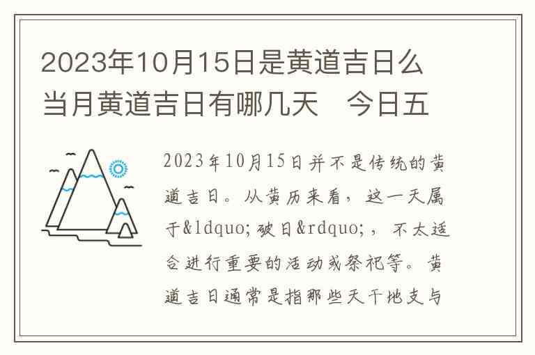 2023年10月15日并不是传统的黄道吉日。从黄历来看,这一天属于“破日”,不太适合进行重要的活动或祭祀等。黄道吉日通常是指那些天干地支与某些传统节气、天象等配合,特别有利于进行婚嫁、搬家、开工等活动的日子。