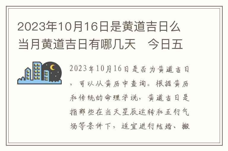 2023年10月16日是否为黄道吉日,可以从黄历中查询。根据黄历和传统的命理学说,黄道吉日是指那些在当天星辰运转和五行气场等条件下,适宜进行结婚、搬家、开业、安葬等重要活动的日子。对于2023年10月16日,若根据黄历查看,这一天并不特别标记为黄道吉日,也没有特殊的天干地支组合推荐为非常吉利的日子。
