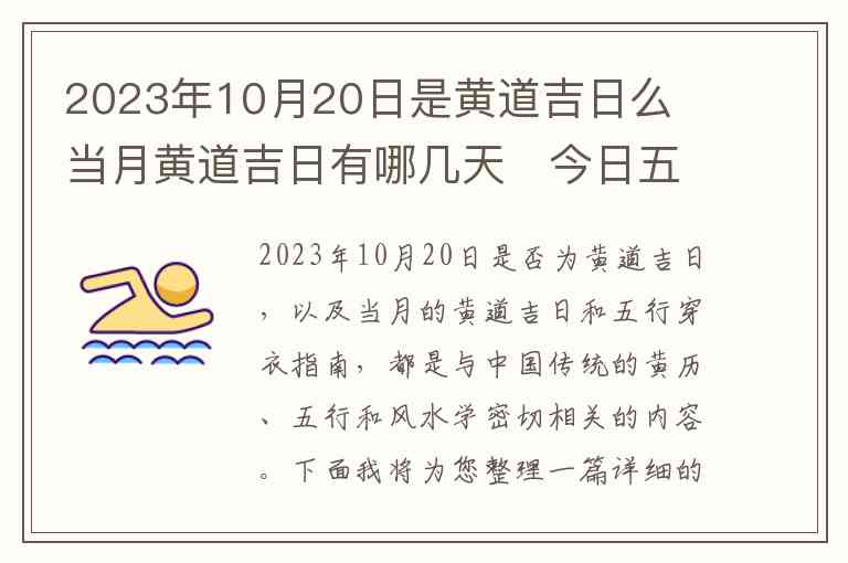 2023年10月20日是否为黄道吉日,以及当月的黄道吉日和五行穿衣指南,都是与中国传统的黄历、五行和风水学密切相关的内容。下面我将为您整理一篇详细的解答。