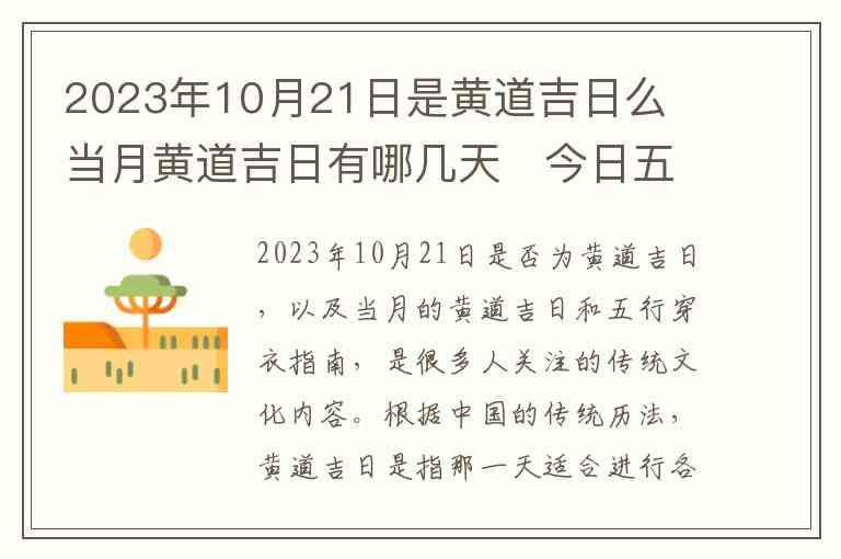2023年10月21日是否为黄道吉日,以及当月的黄道吉日和五行穿衣指南,是很多人关注的传统文化内容。根据中国的传统历法,黄道吉日是指那一天适合进行各种活动,如结婚、开工、搬家等,有利于顺利和繁荣。而五行穿衣指南则是依据五行八字理论,结合当日的五行属性来选择衣服的颜色和款式。