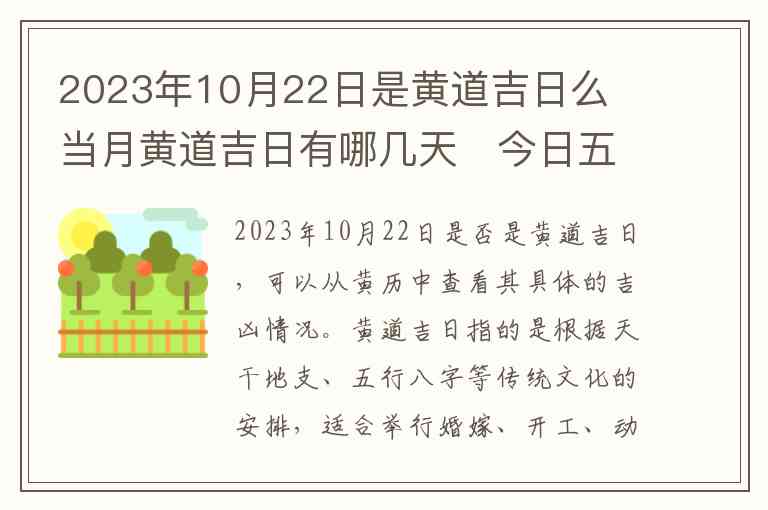 对于2023年10月22日来说,按黄历的标准,它并非典型的黄道吉日。从五行与天象上来说,10月22日的五行可能涉及到土与金的属性,也可能适合进行某些特定的活动。具体情况需要根据每个人的生辰八字来进行更加细致的推算,但总体来说,10月22日并没有特别被标注为吉日。