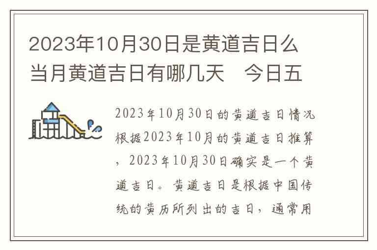 根据2023年10月的黄道吉日推算,2023年10月30日确实是一个黄道吉日。黄道吉日是根据中国传统的黄历所列出的吉日,通常用于选择适宜的日子进行婚嫁、开工、搬家、求职等重要事项。对于这一天而言,它在传统的黄历中被视作一个适宜的日子,符合诸如"破土、修造、安床、开市"等活动的宜忌要求。