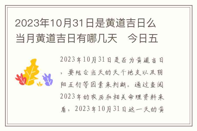 2023年10月31日是否为黄道吉日,要结合当天的天干地支以及阴阳五行等因素来判断。通过查阅2023年的农历和相关命理资料来看,2023年10月31日这一天的黄历并不被列为“黄道吉日”。通常,黄道吉日是指在传统黄历上,经过天文和气象等因素计算后,适宜举行重大活动如婚嫁、开业、动土等的日子。