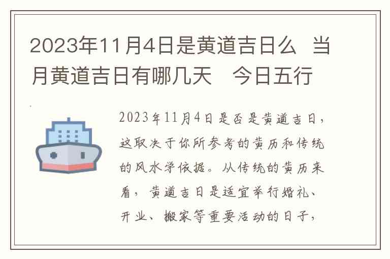2023年11月4日是否是黄道吉日,这取决于你所参考的黄历和传统的风水学依据。从传统的黄历来看,黄道吉日是适宜举行婚礼、开业、搬家等重要活动的日子,它们通常被认为有利于人们的运势。然而,是否为黄道吉日通常需要结合具体的日历以及当时的天象、五行等因素来判断。