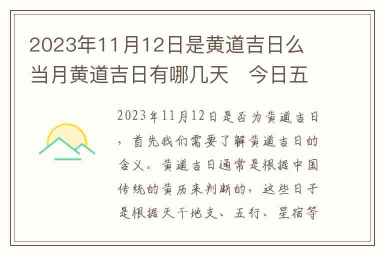 2023年11月12日是否为黄道吉日,首先我们需要了解黄道吉日的含义。黄道吉日通常是根据中国传统的黄历来判断的,这些日子是根据天干地支、五行、星宿等多方面的因素来推算的,被认为是适合进行婚嫁、安宅、出行、开工等活动的日子。
