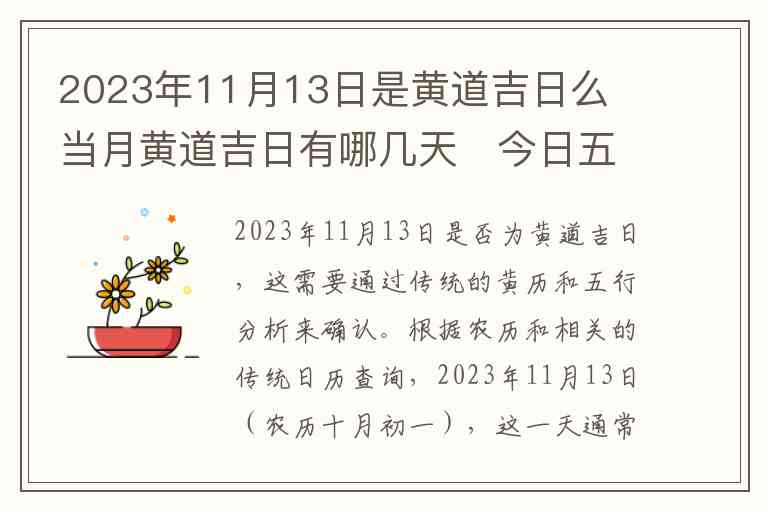 2023年11月13日是否为黄道吉日,这需要通过传统的黄历和五行分析来确认。根据农历和相关的传统日历查询,2023年11月13日(农历十月初一),这一天通常被认为是一个较为适合开始新事物的日子,因此被视为黄道吉日之一。黄道吉日一般是指在黄历中推荐做事的好日子,通常有利于结婚、搬家、开业等活动。