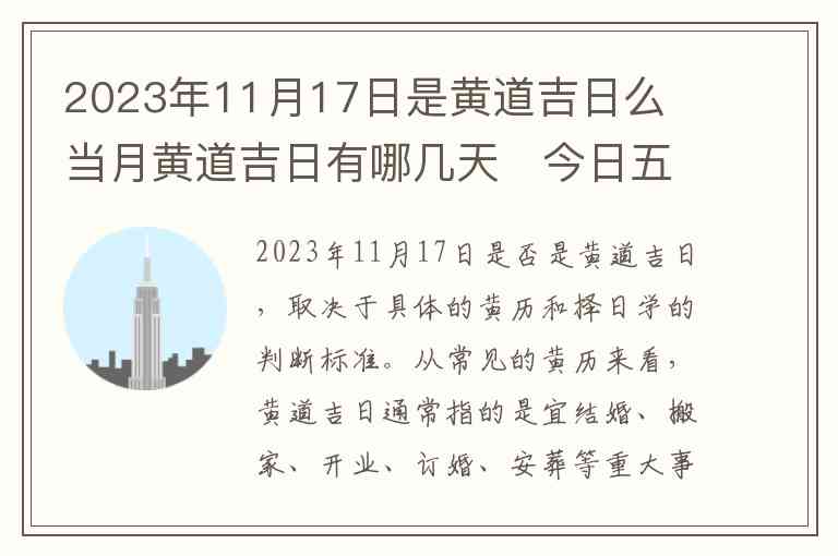 2023年11月17日是否是黄道吉日,取决于具体的黄历和择日学的判断标准。从常见的黄历来看,黄道吉日通常指的是宜结婚、搬家、开业、订婚、安葬等重大事项的日子。而在一些传统的黄历系统中,11月17日并没有被列为一个特别显著的吉日。